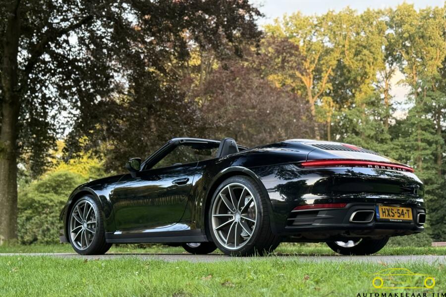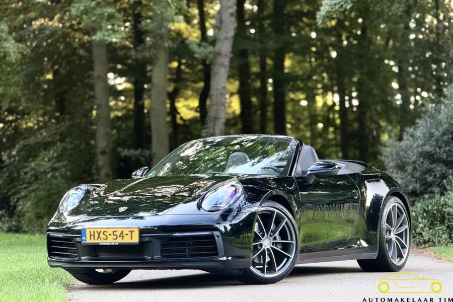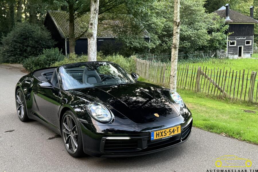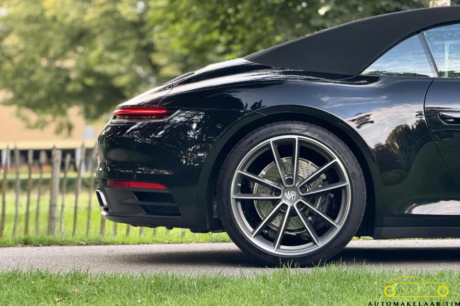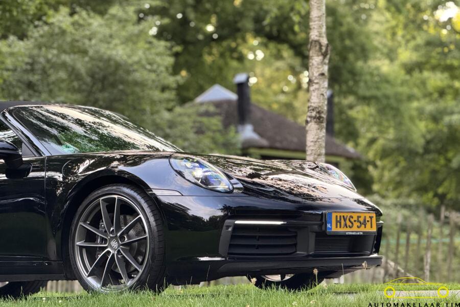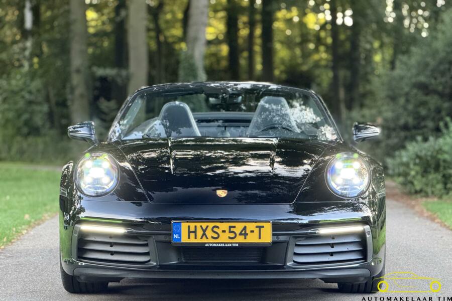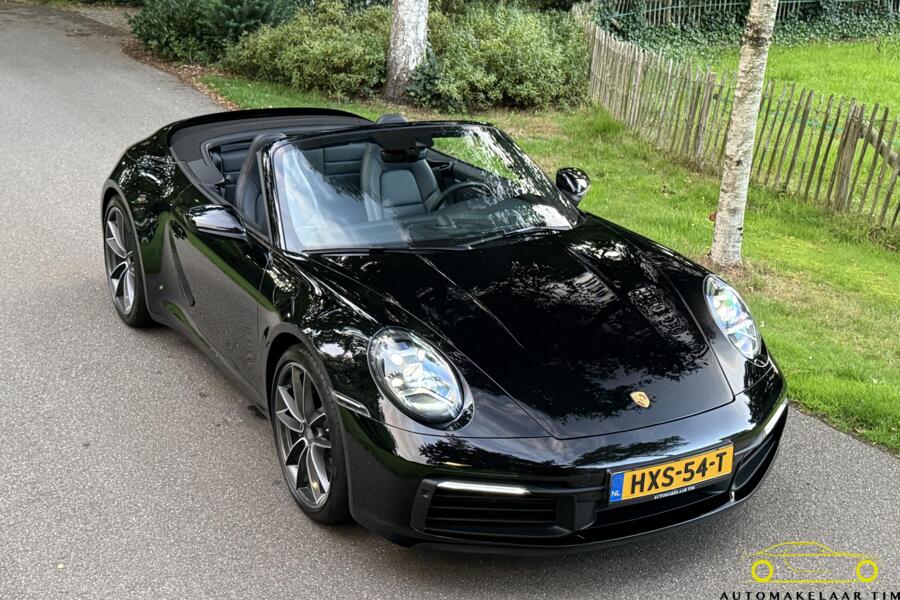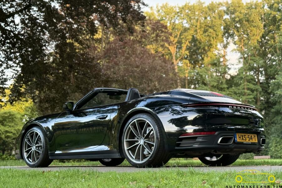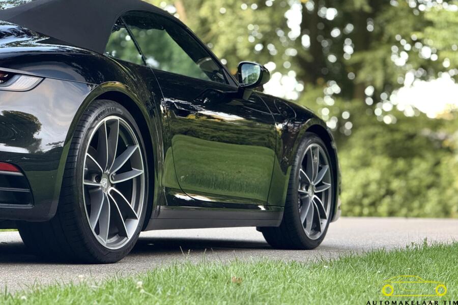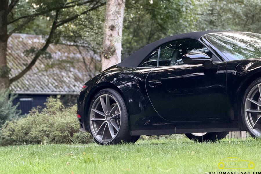 Prachtig uitgevoerde Porsche 992 Cabrio, en de foto's liegen er niet om, Zwart op zwart is altijd een goede combinatie en deze Porsche is diepzwart, gecombineerd met 21 inch velgen zeer stijlvol.