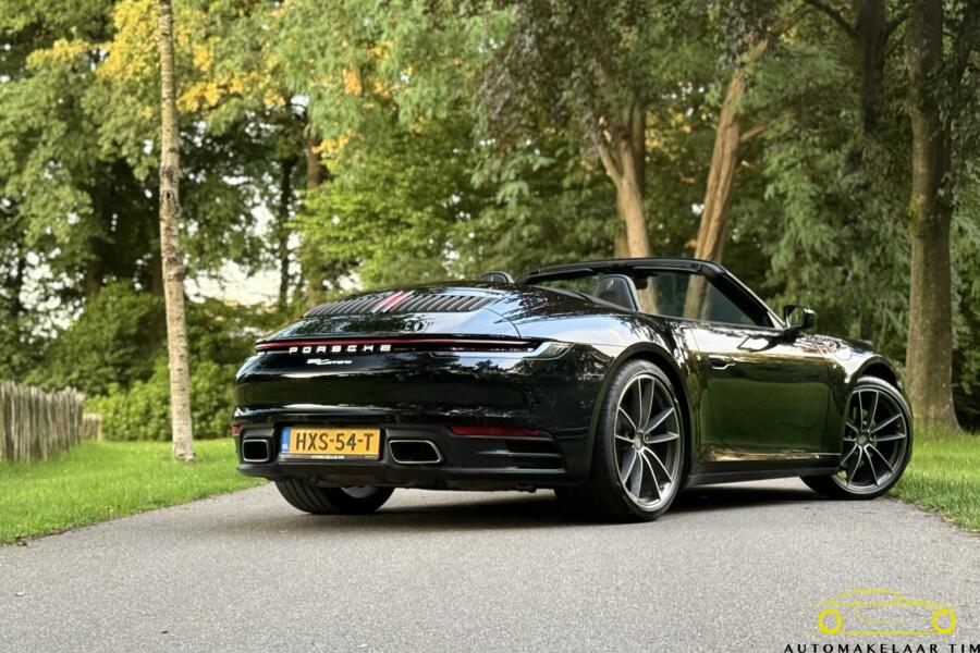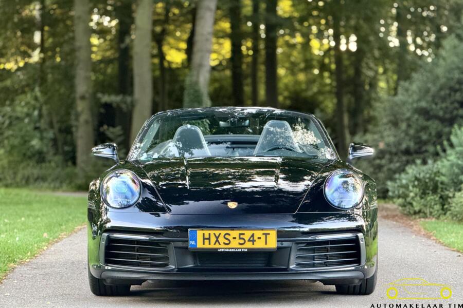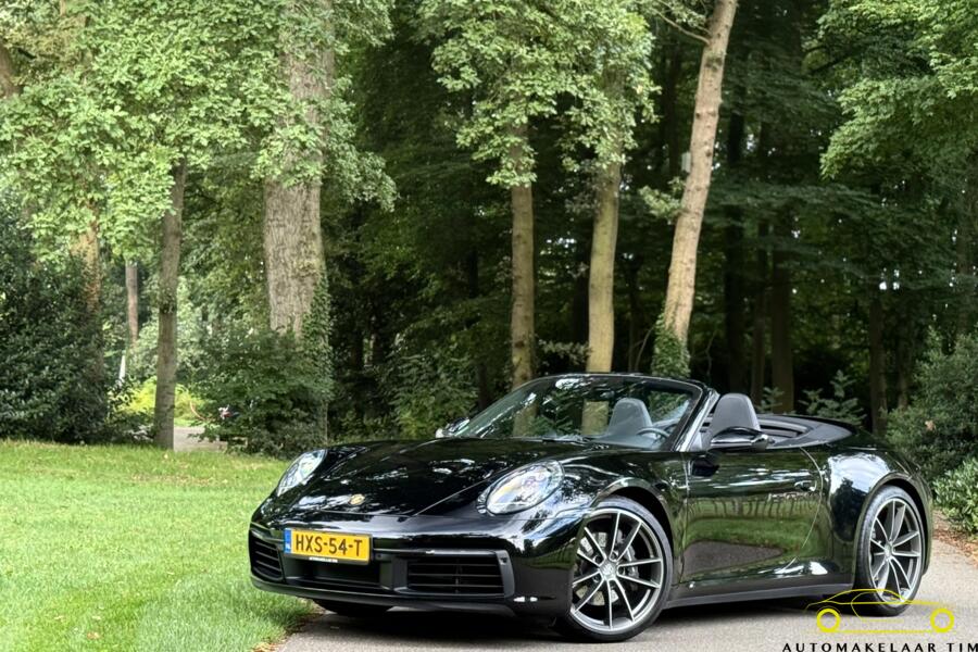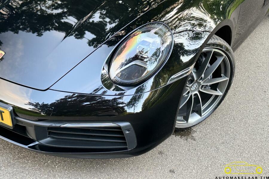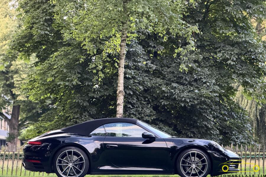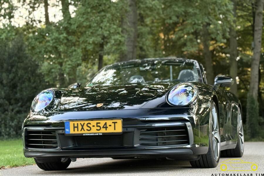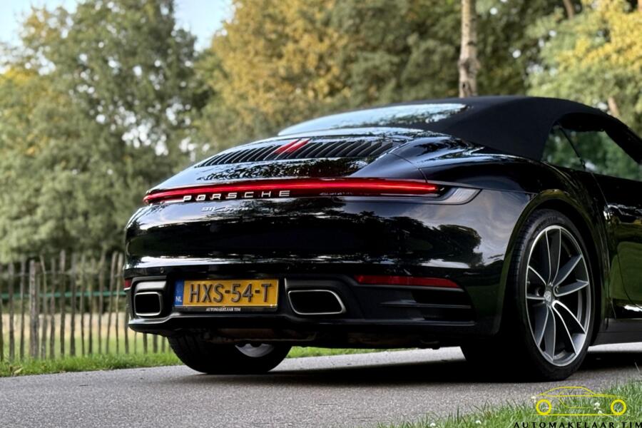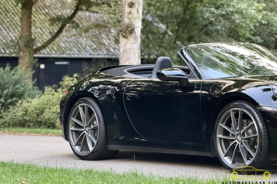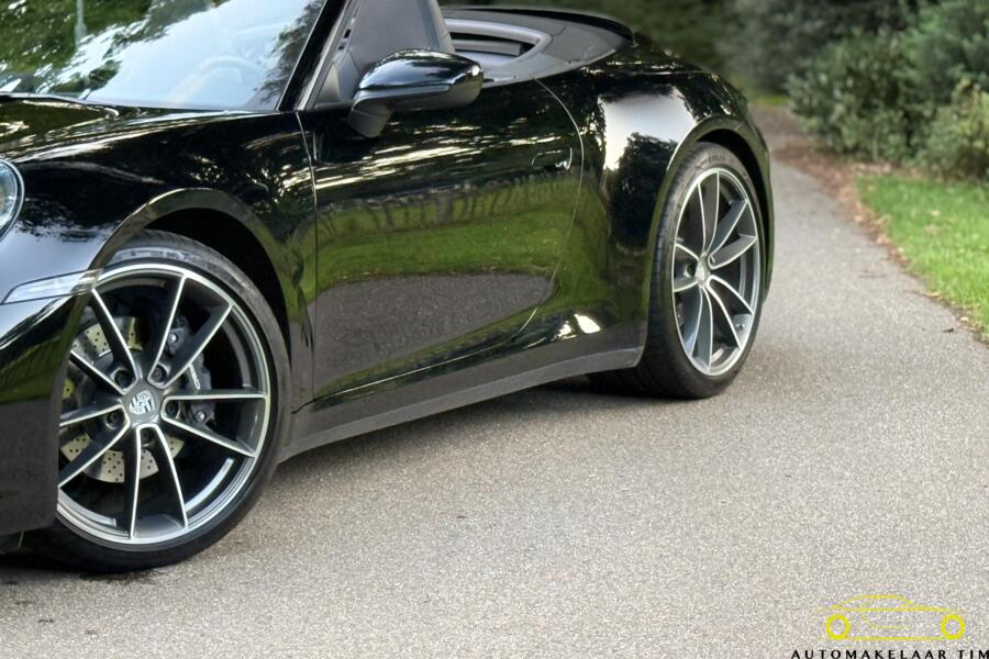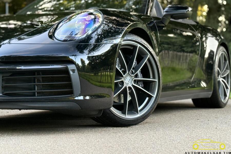 Prachtig uitgevoerde Porsche 992 Cabrio, en de foto's liegen er niet om, Zwart op zwart is altijd een goede combinatie en deze Porsche is diepzwart, gecombineerd met 21 inch velgen zeer stijlvol.