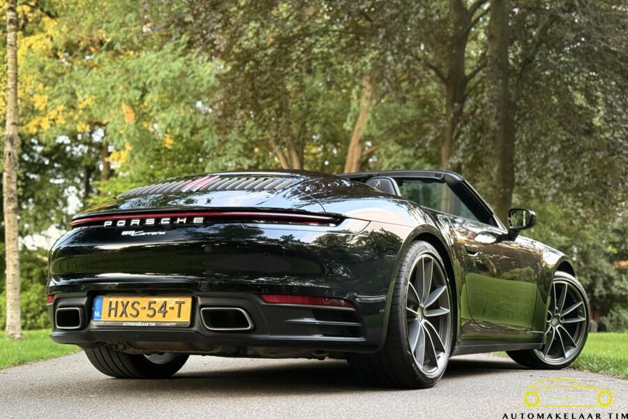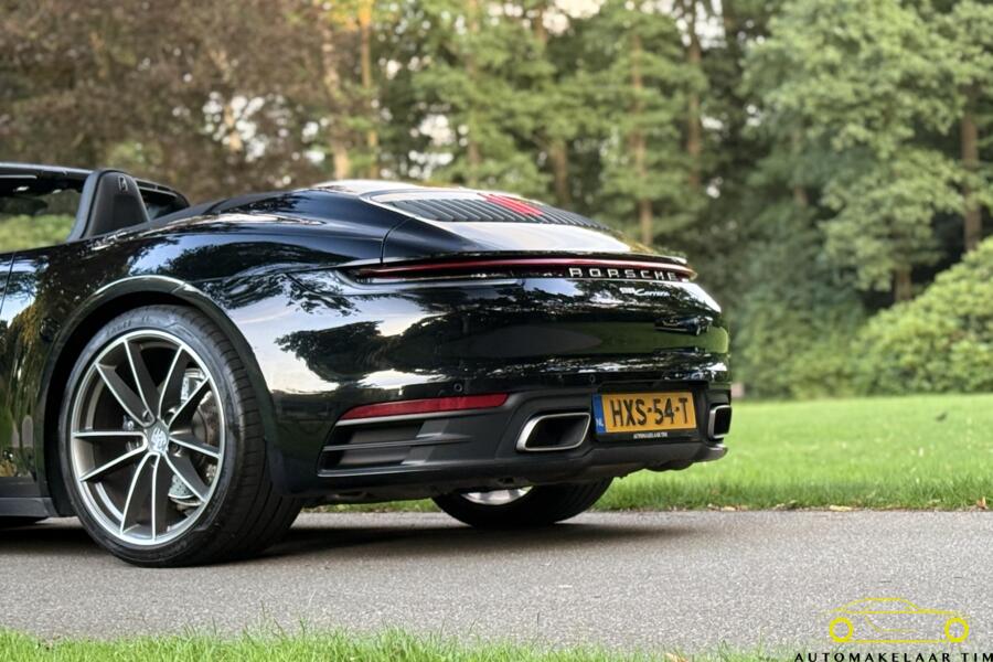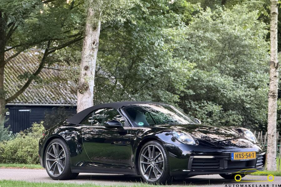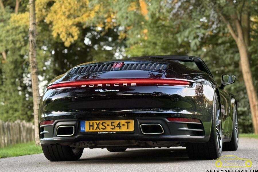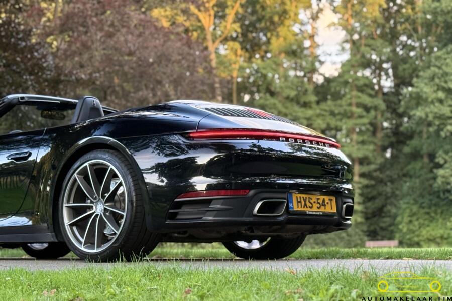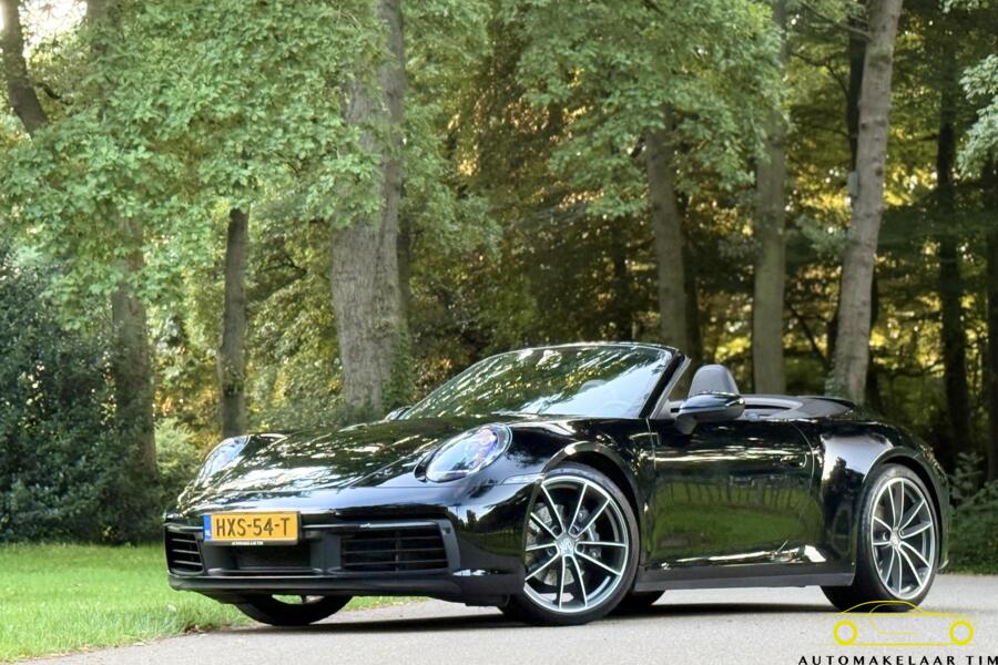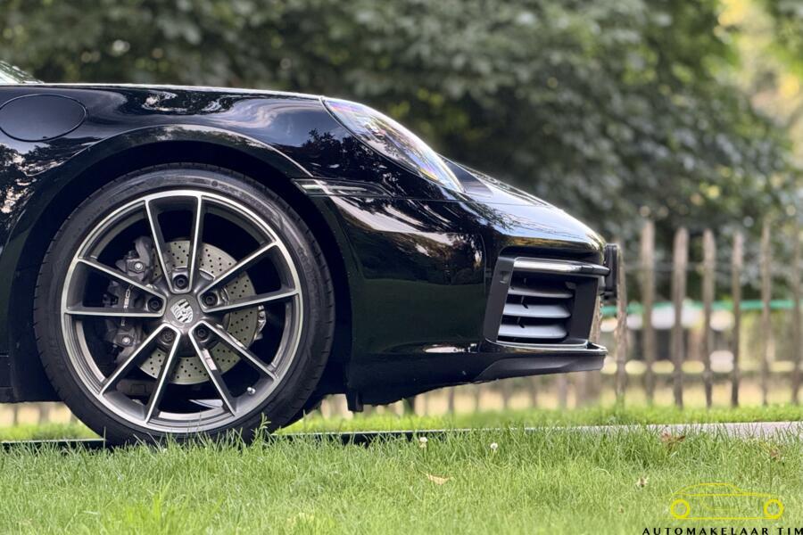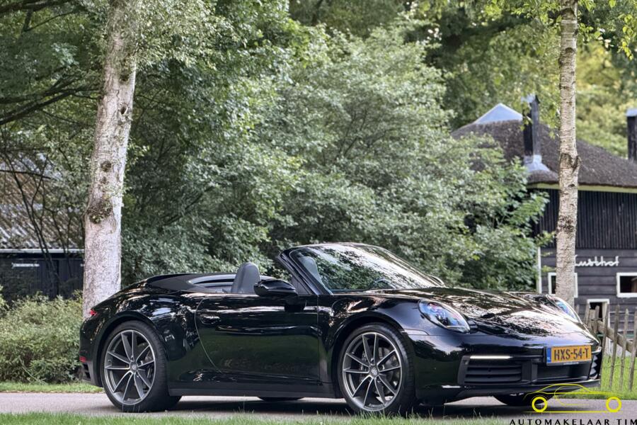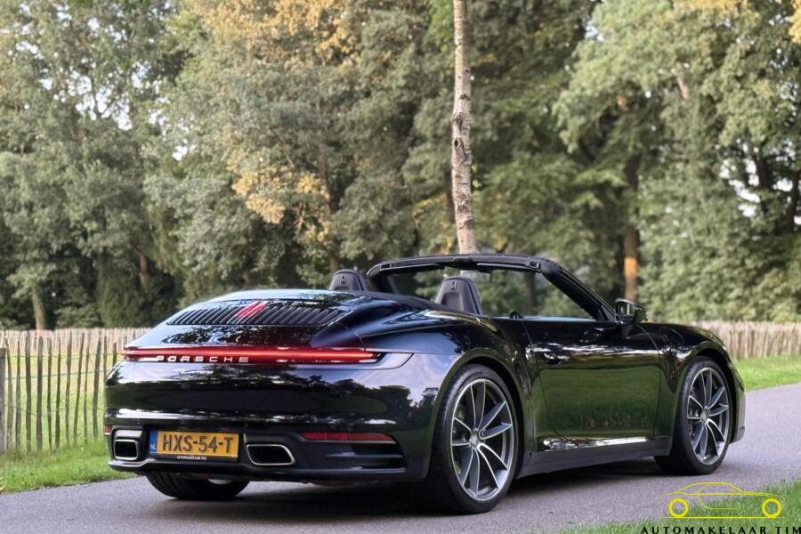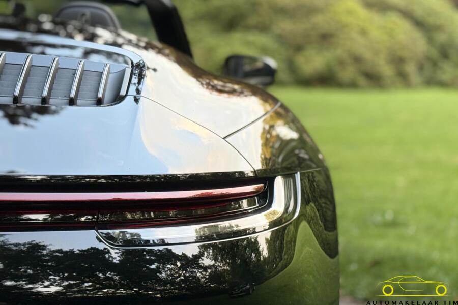 Prachtig uitgevoerde Porsche 992 Cabrio, en de foto's liegen er niet om, Zwart op zwart is altijd een goede combinatie en deze Porsche is diepzwart, gecombineerd met 21 inch velgen zeer stijlvol.